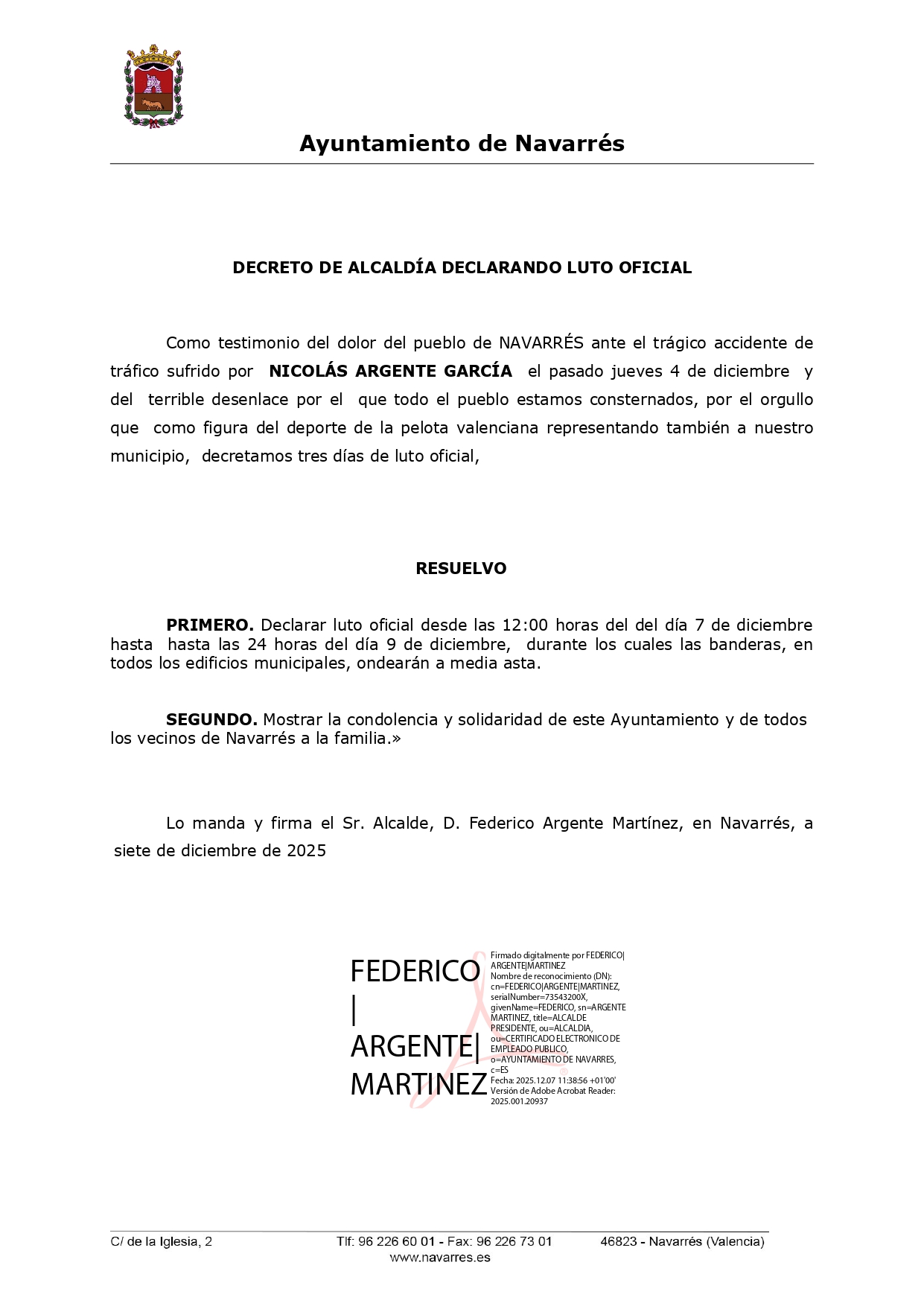 Como testimonio del dolor del pueblo de NAVARRÉS ante el trágico accidente de tráfico sufrido por NICOLÁS ARGENTE GARCÍA el pasado jueves 4 de diciembre y del terrible desenlace por el que todo el pueblo estamos consternados, por el orgullo que como figura del deporte de la pelota valenciana representando también a nuestro municipio, decretamos tres días de luto oficial,